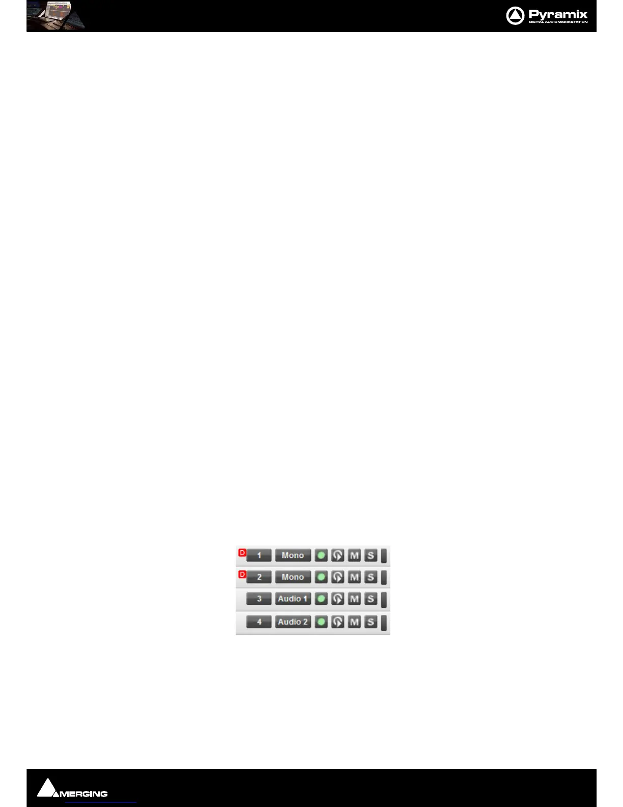 feeding Direct Monitoring Input Strips show a small red box with ‘D’ in the header: