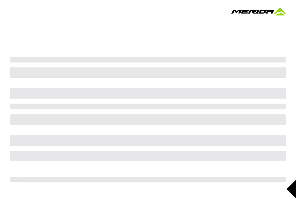 It is advisable to have your MERIDA bike serviced regularly after the bedding-in phase. The schedule given in the table below is a rough guide for cyclists who