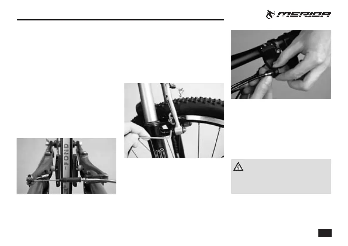 The brake pads should hit the rim simulta-