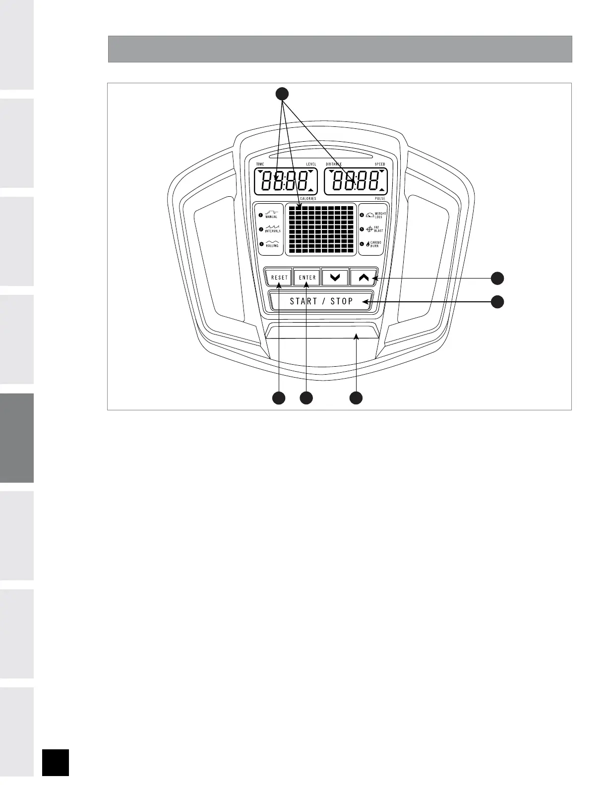 A) MONITOR DISPLAYS: Speed, Time, Pulse, Distance, Level, Calories and Program Profiles.