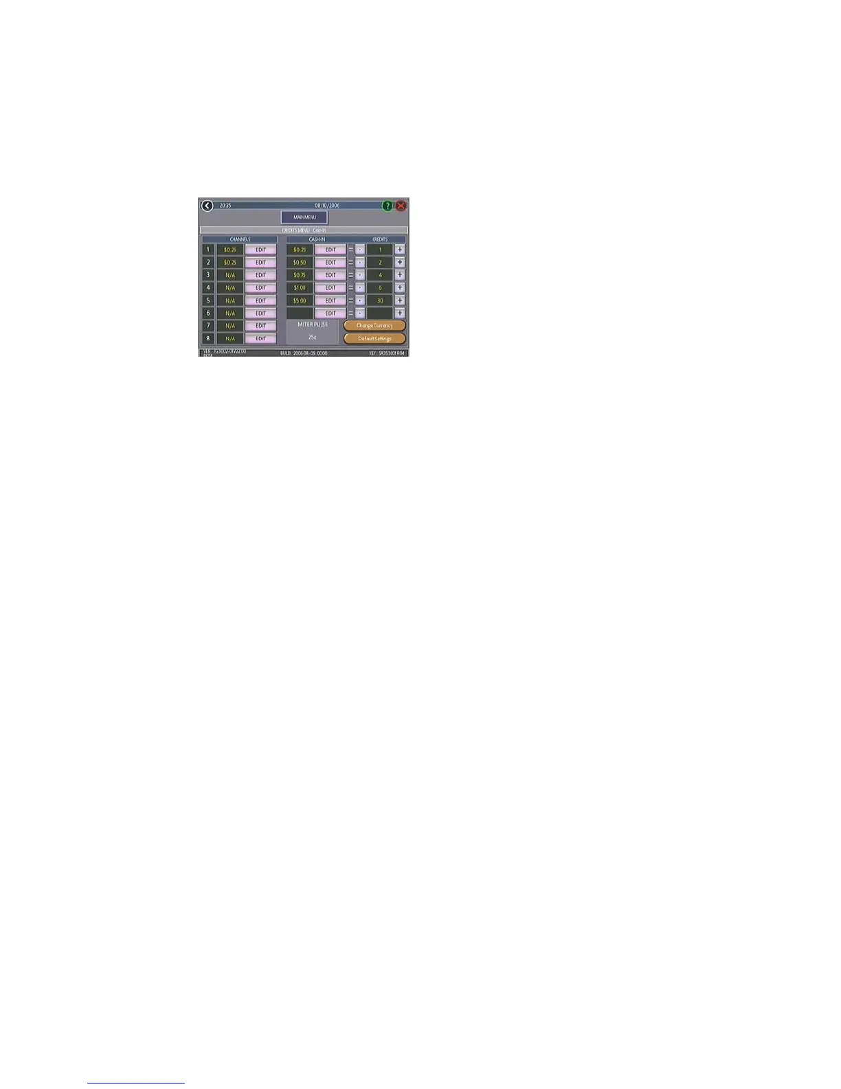 Coin-In Menu. Touching the Default Set-