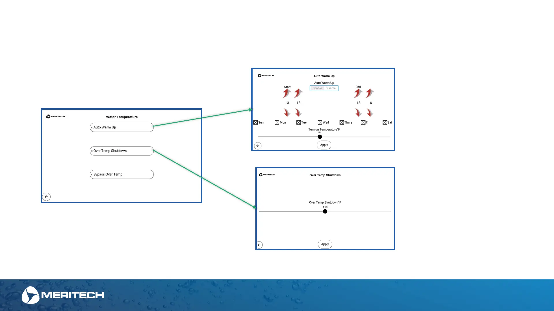 The water temperature screen and its sub-menus allow