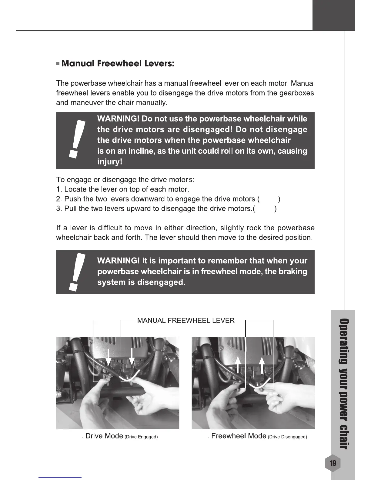 Merits P326D - Operating Your Power Wheelchair; Manual Freewheel Levers