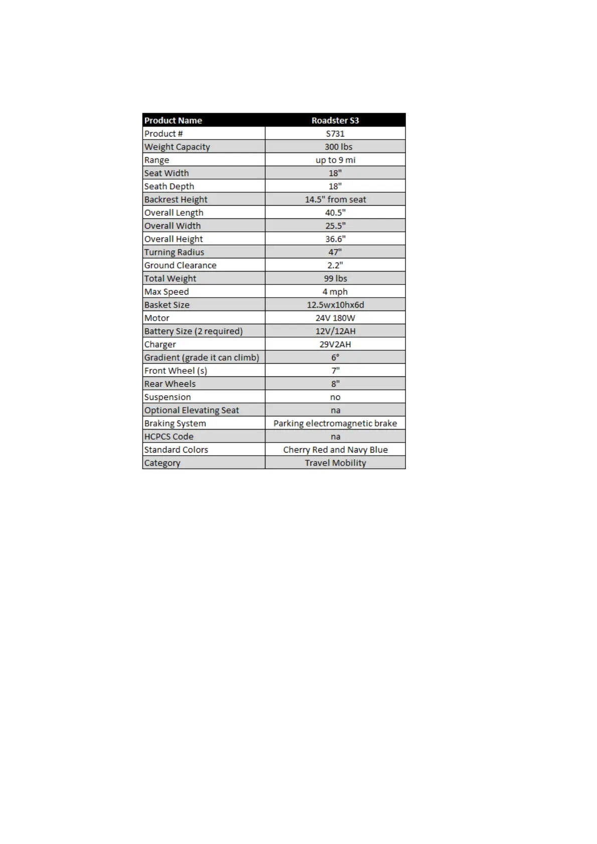 Merits S731 - Technical Specifications; Roadster S3 Specifications