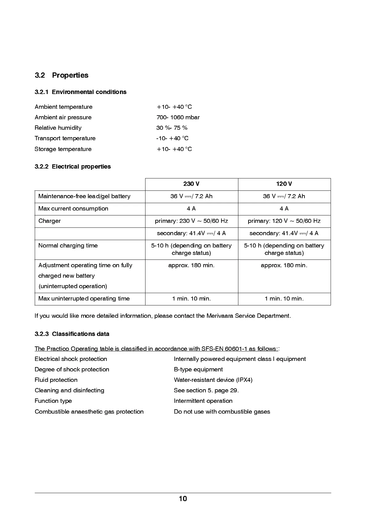 The Practico Op era ting tab le is clas s ifie d in accord an ce with SF S -E N 60601-1 as foll ows :