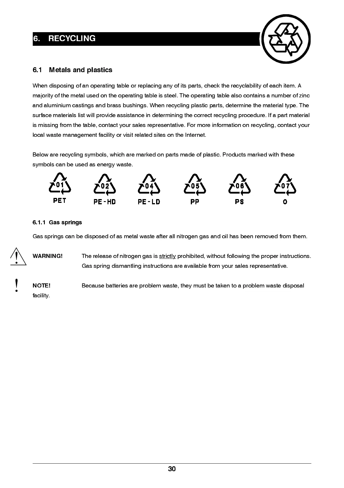 W hen disposing of an operating table or replacing any of its parts, check the recyclability of each item. A