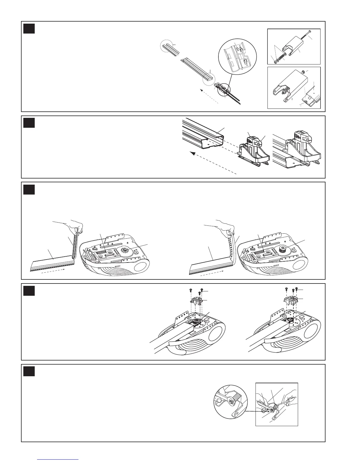 assembly. Holding chain (4) or belt (5) out of the way, slide rail (1) onto shim (2) until rail is secure. Take the