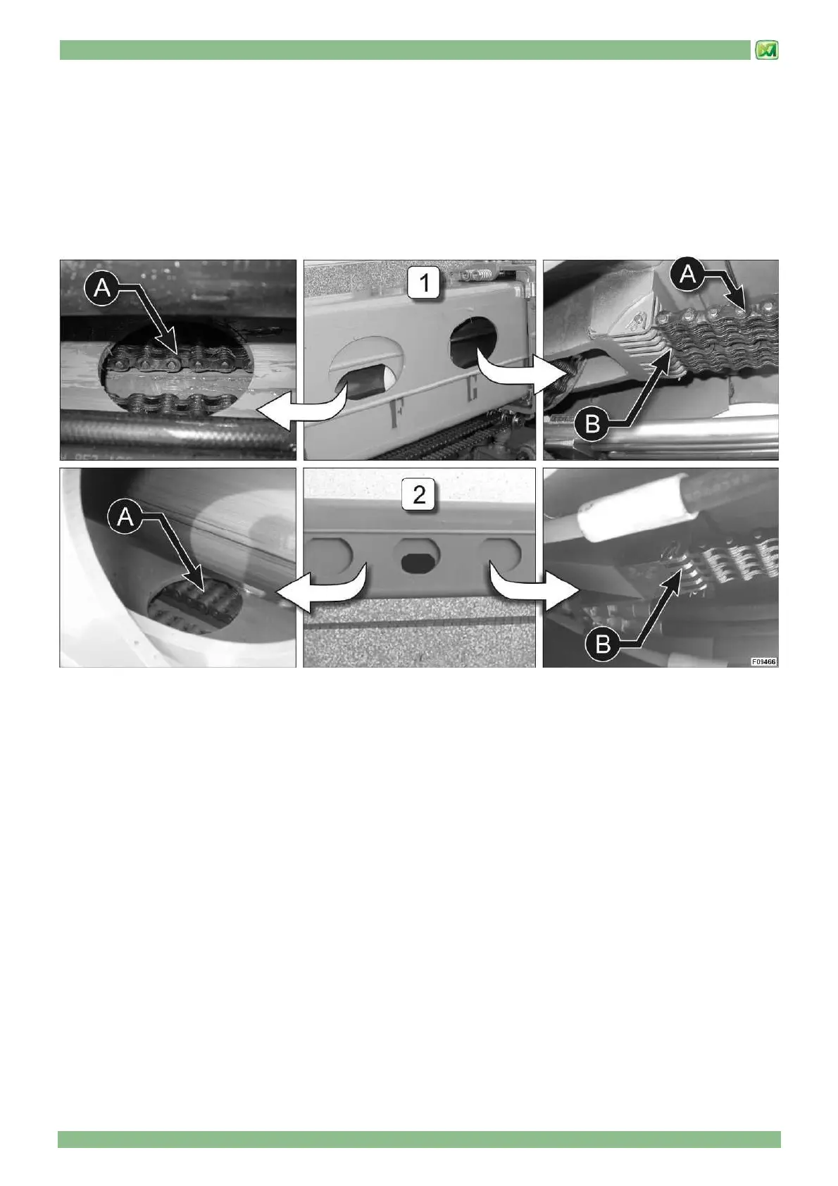 To check the integrity and the state of wear of chains "A", as well as their correct fitting on combs "B", extend the telescopic