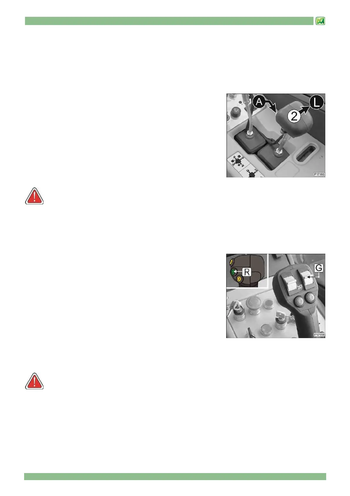 WARNING! If the button (R) is pressed and the RH thumb-wheel is turned to position "G", when the bucket is