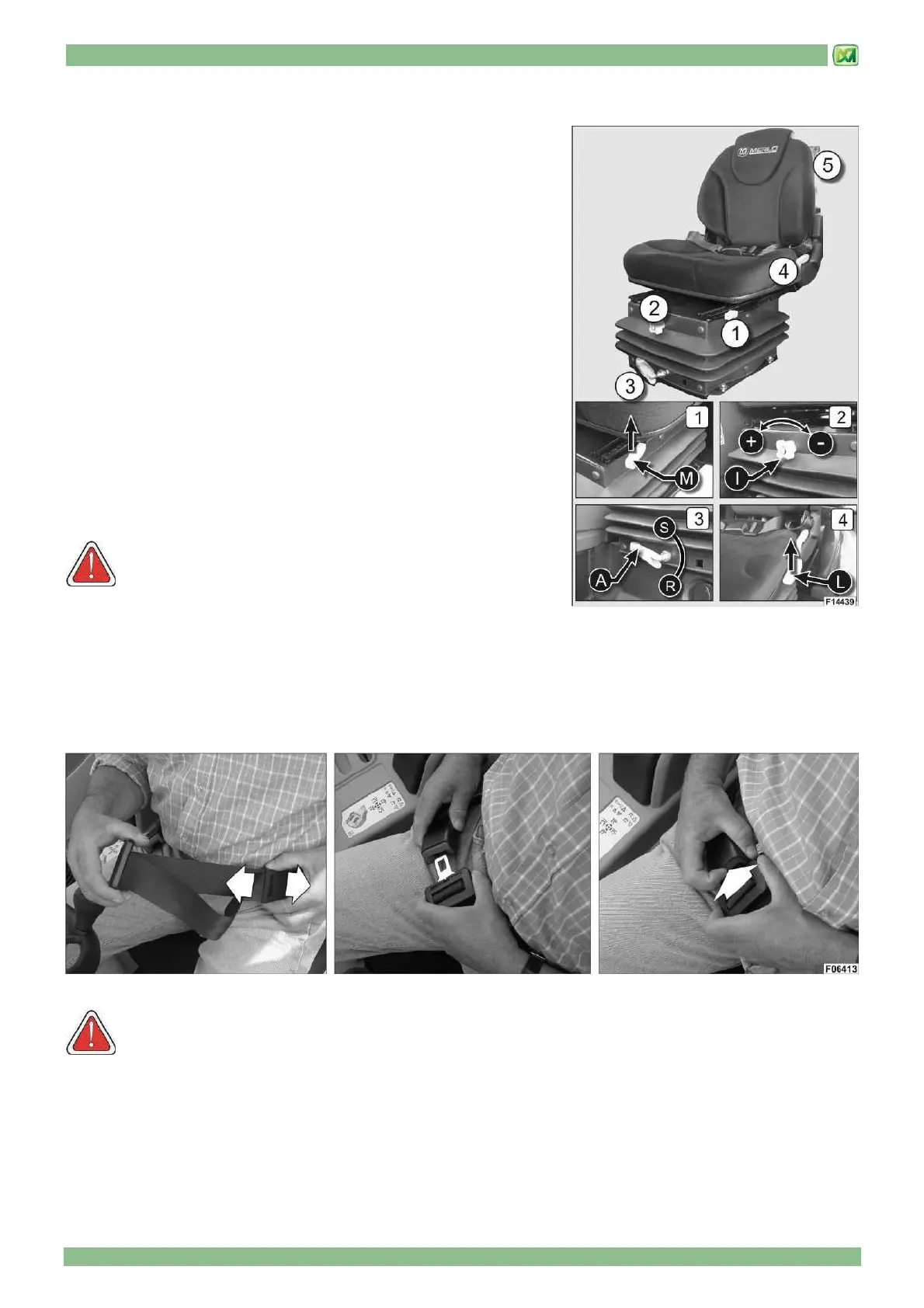 ATTENTION! Before operating the machine always fasten the seat belt and close the lower part of the door