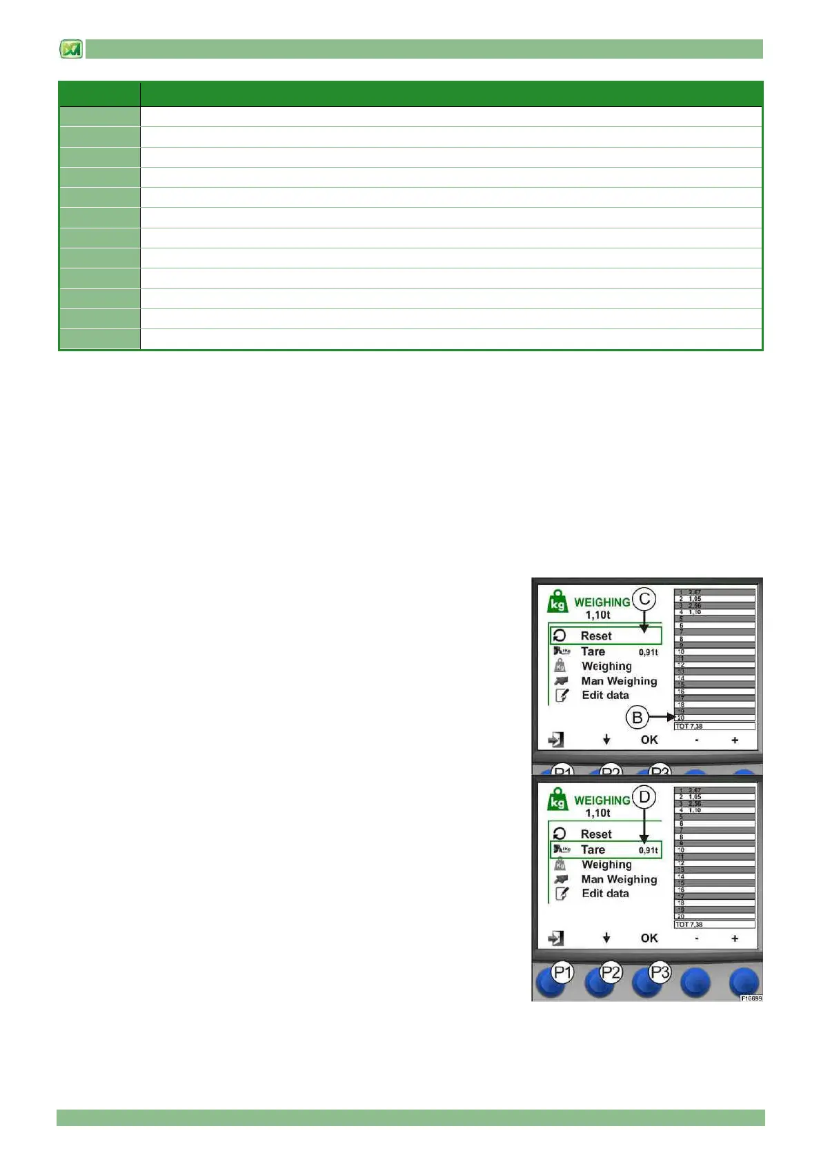 The tare command is performed from the weighing screen using the button (P2),