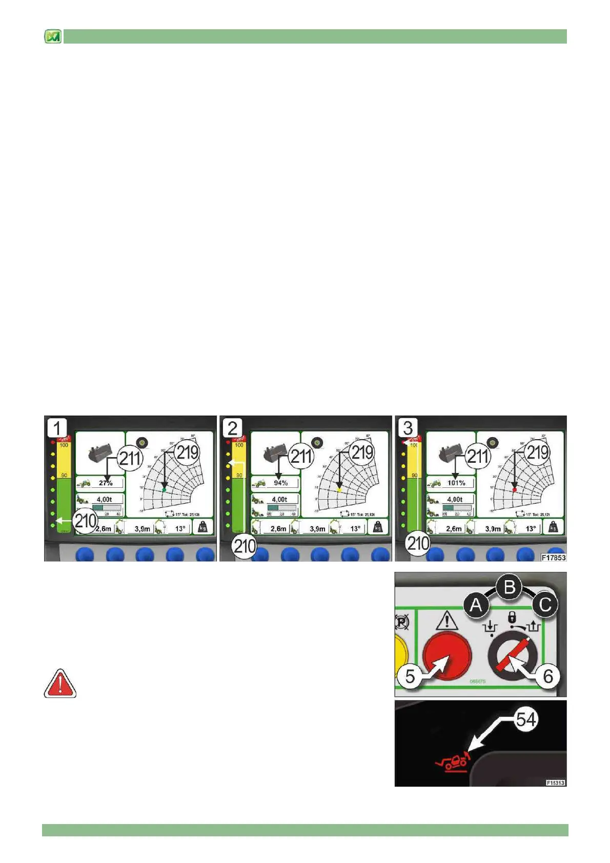 stability percentage. These values are shown on the display D) in the cab in 3 different ways: