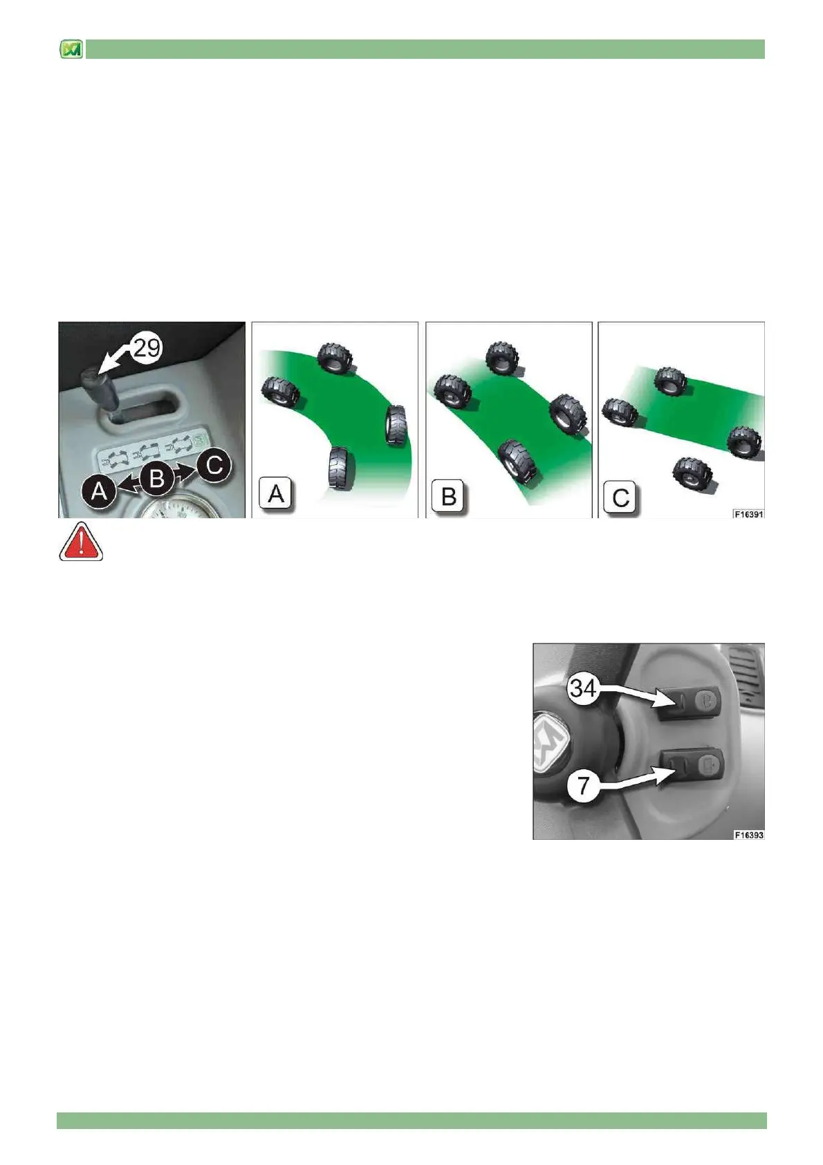 The selection of a different steering mode must be made when the machine is standing still and all wheels are aligned with the