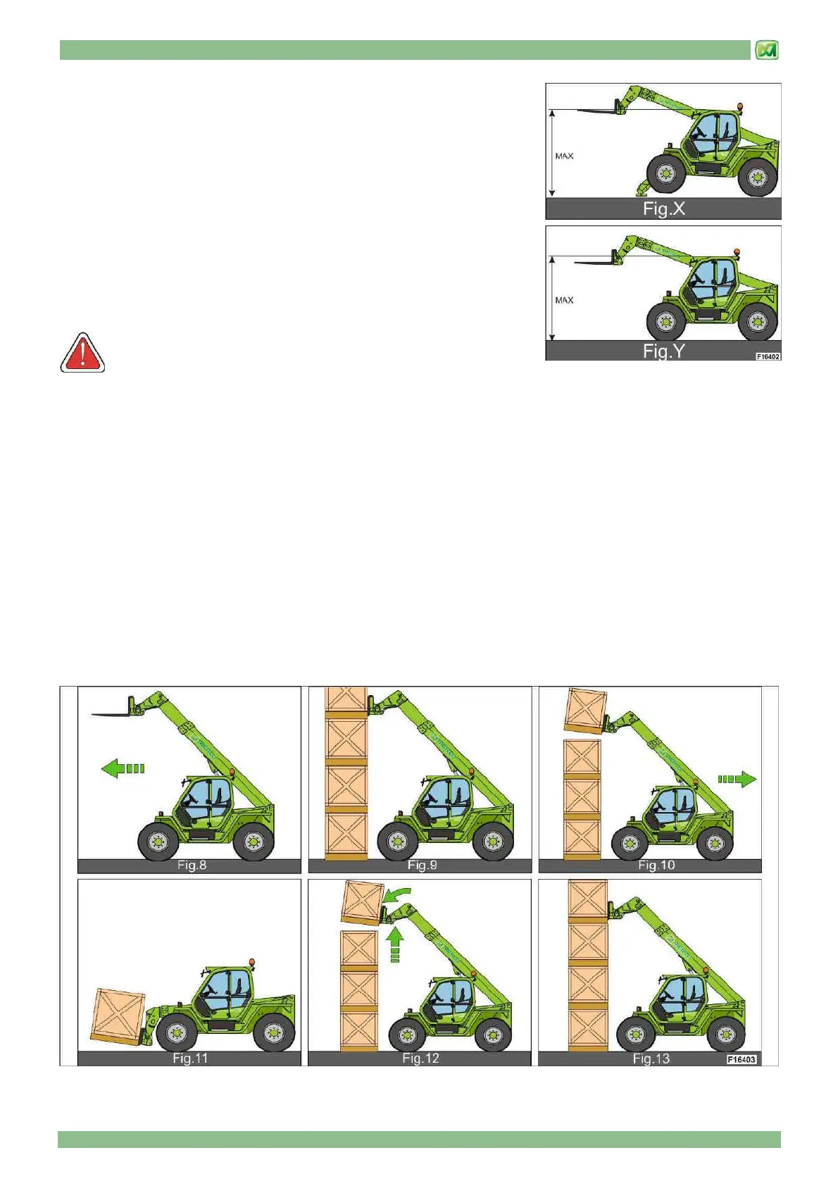 - lift and extend the telescopic boom until the load is above the stack; if necessary advance the machine with care. (Fig.12)