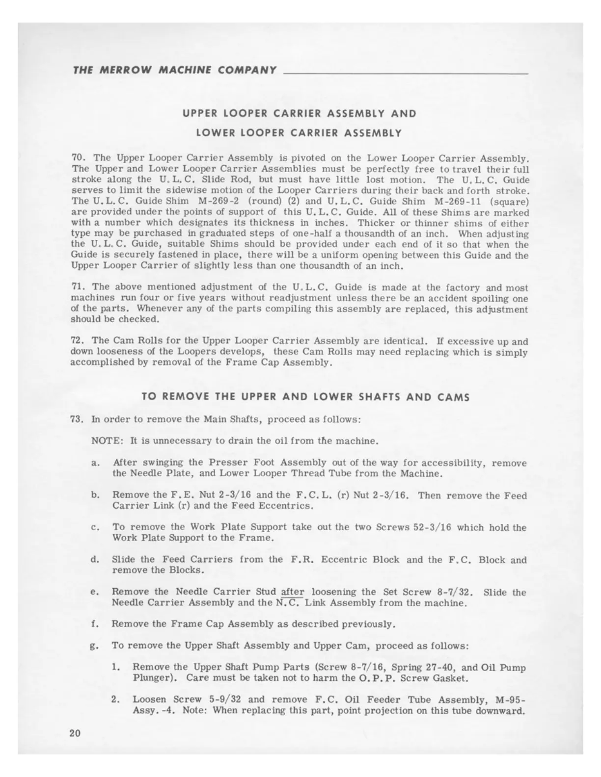 Merrow 70-D3B - Looper Carrier Assembly Function; Looper Carrier Movement; Removing Upper and Lower Shafts and Cams; Pre-removal Steps