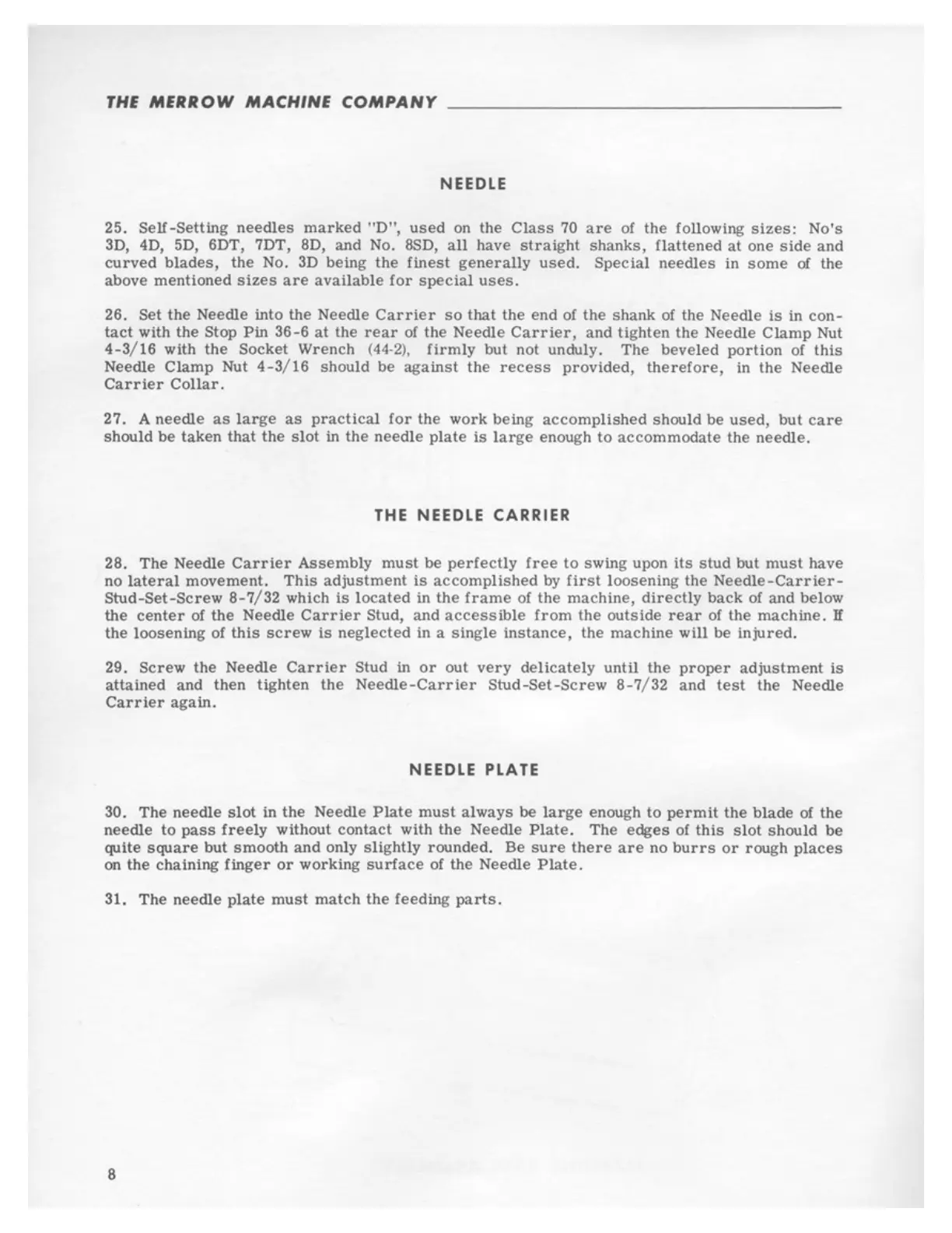 Merrow 70-D3B - Needle Selection and Installation; Available Needle Sizes; Setting the Needle Correctly; Needle Carrier Adjustment