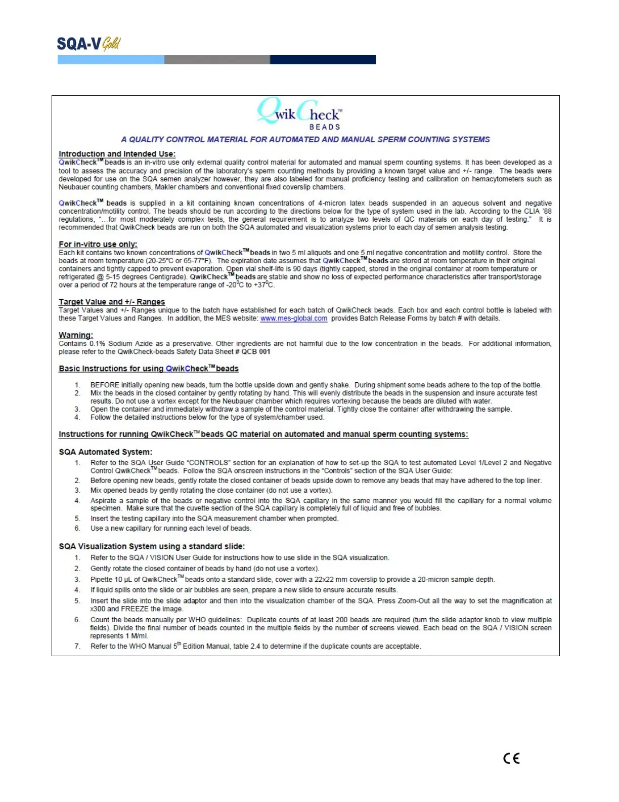MES SQA-V Gold - APPENDIX 10: Assayed Control: QwikCheck Beads; Introduction and Intended Use; For in-vitro use only; Target Value and +;- Ranges