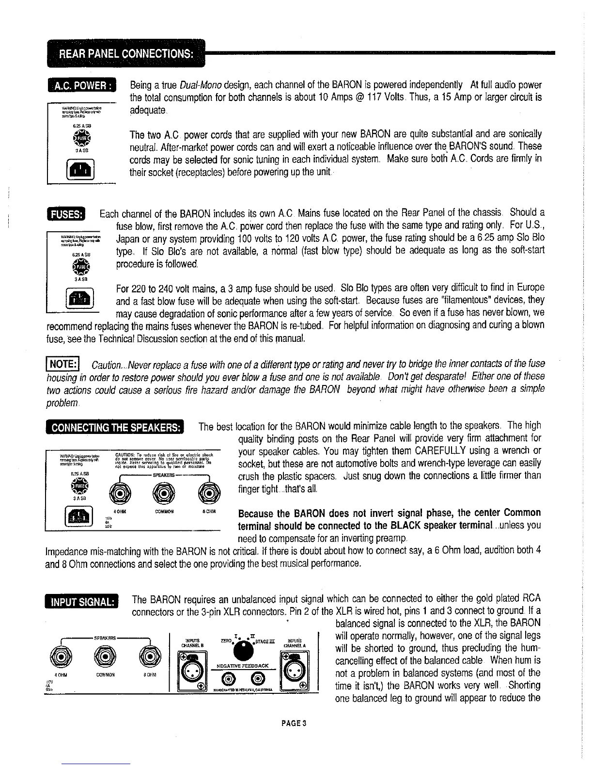 Mesa BARON - Rear Panel Connections; AC Power and Fuse Information; Speaker and Input Connectivity