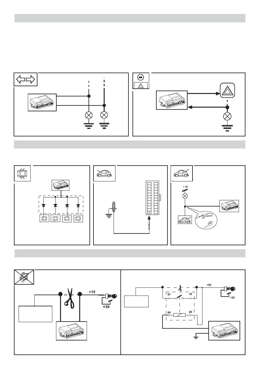 aux lampes (Fig. 13) ou par le pilotage par signal négatif direct au bouton Blinker de la voiture. Comme pour les alarmes