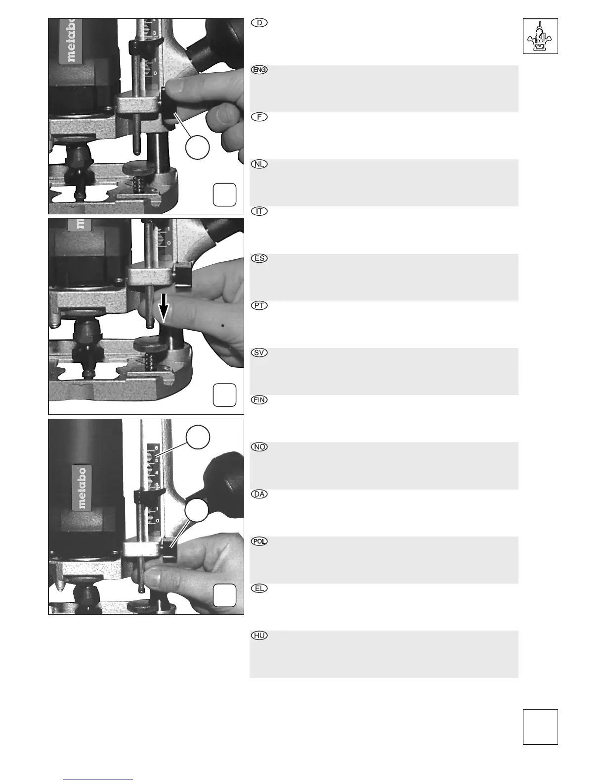 D: Inställ fräsdjupet enligt skala (1) grovt på förhand.