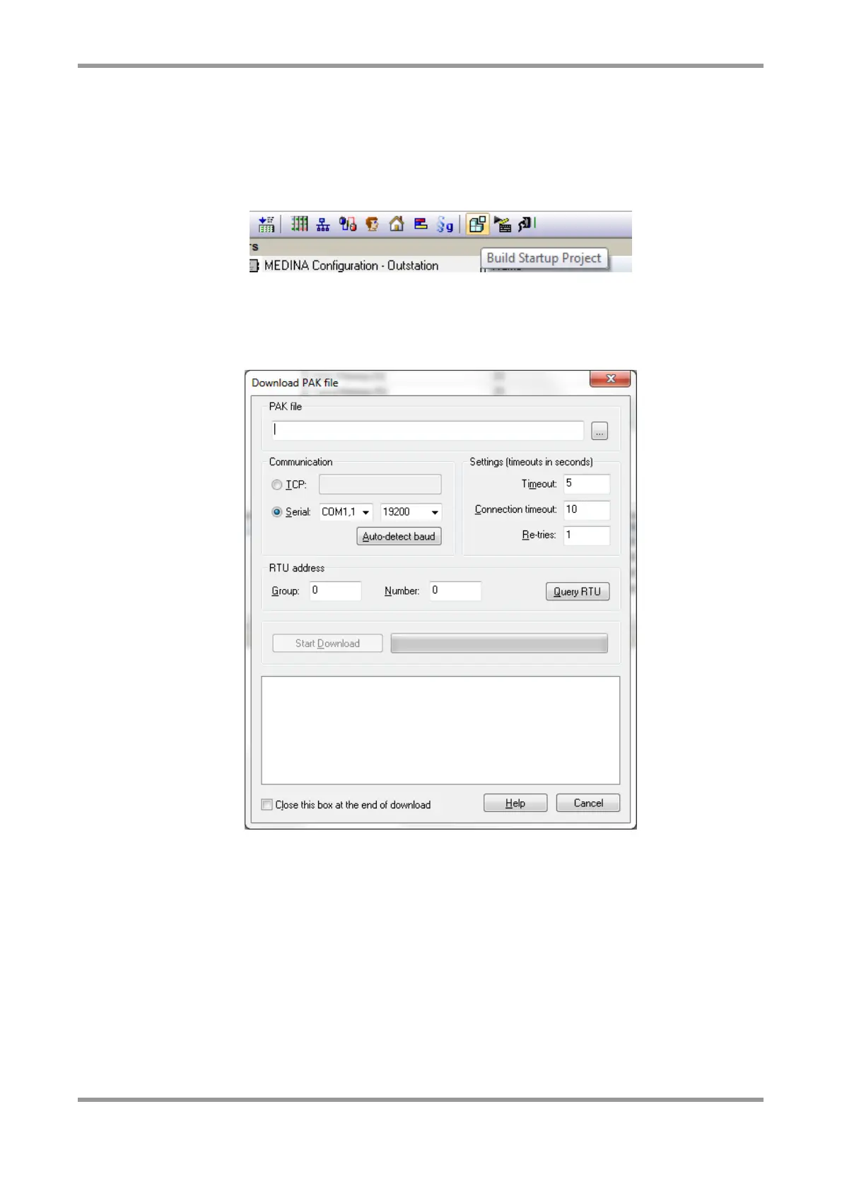 You must first establish the communication link between your PC and the RTU. The