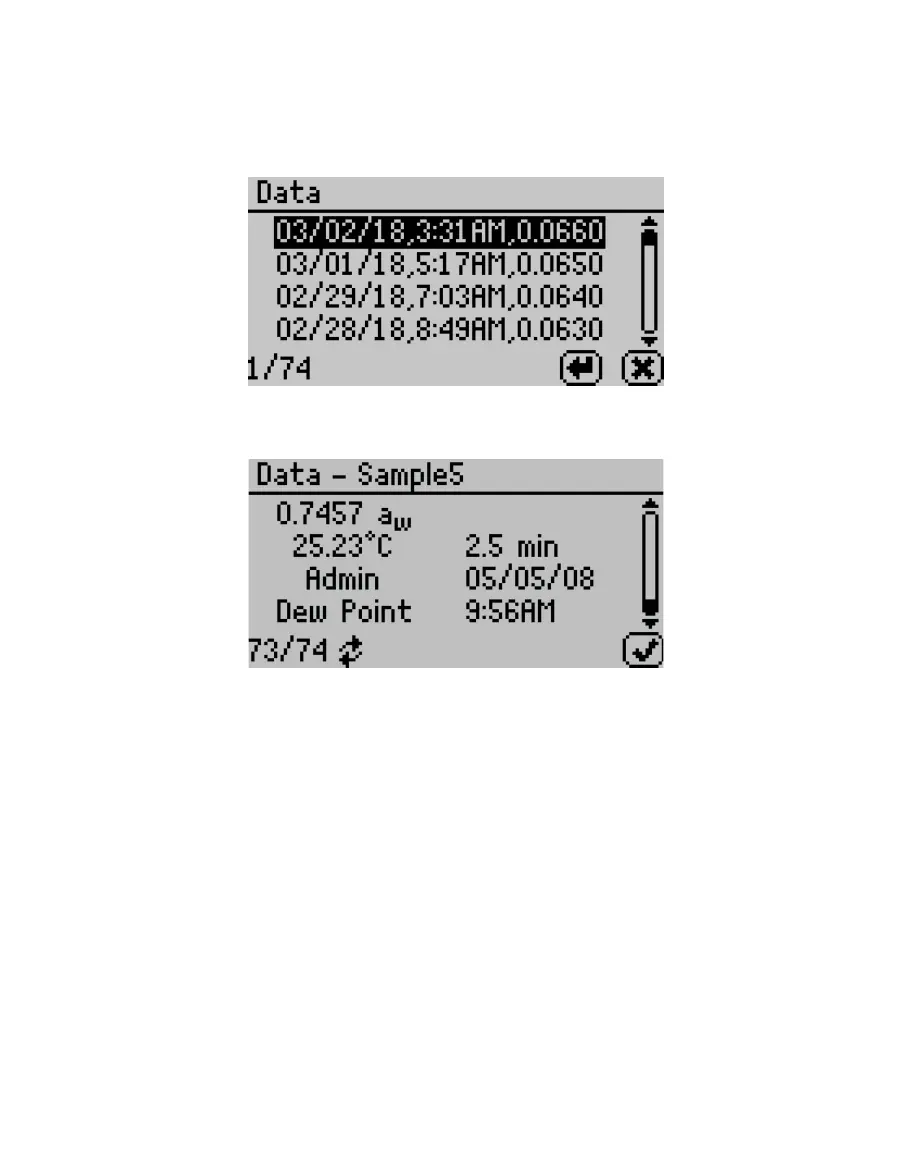 The screen displays the name of the reading (if annotated), the water activity of the sample,