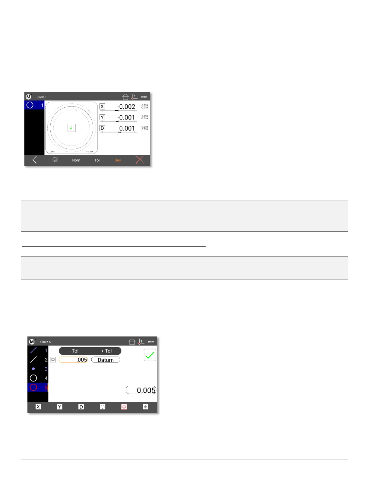 deviation of the X, Y, and D dimensions will also be displayed. Tolerance failures will be displayed in red. There is