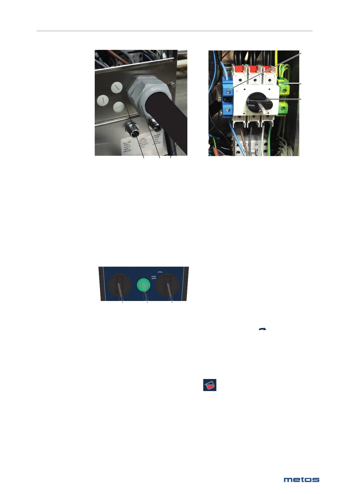 of the lead-through plate. Connect the phase wires of the cable to the mains switch (4) and PE and N