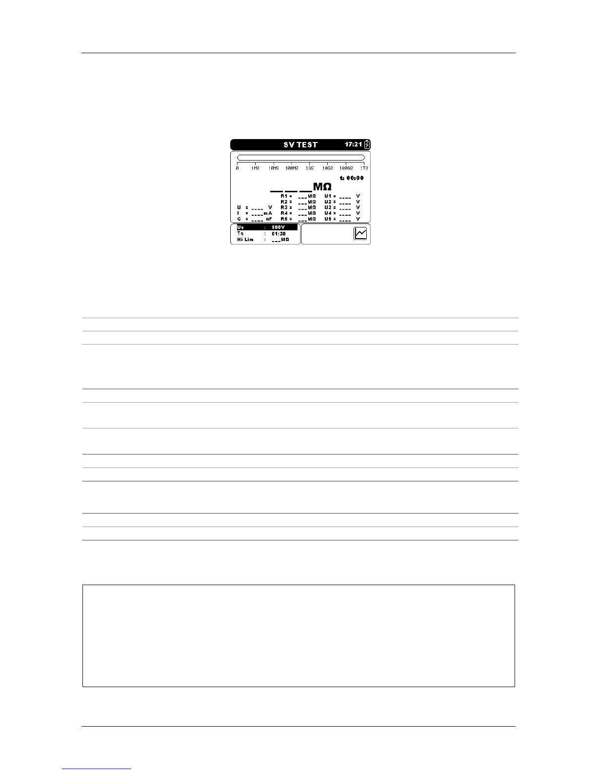 Set test voltage – step 50 V (50 V – 1 kV) and 100 V (1 kV – 5 kV).
