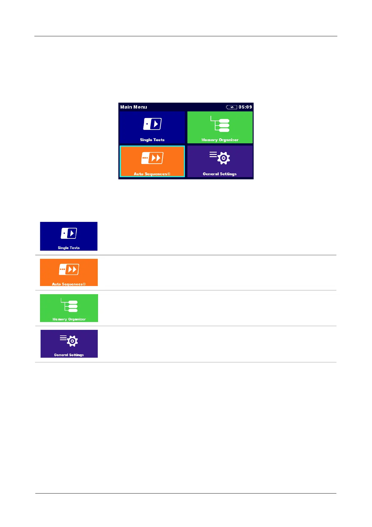 Menu with customized test sequences, see chapter 12 Auto Sequences®