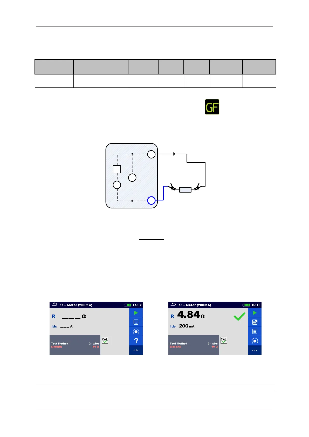 Test can be started from the Ω - Meter (200 mA) measurement window. Before carrying out a