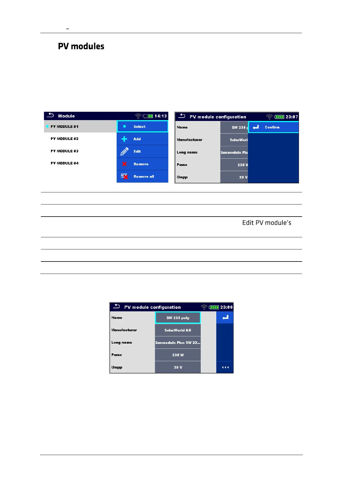 In this menu a list of PV modules and their data can be managed. The PV modules data from