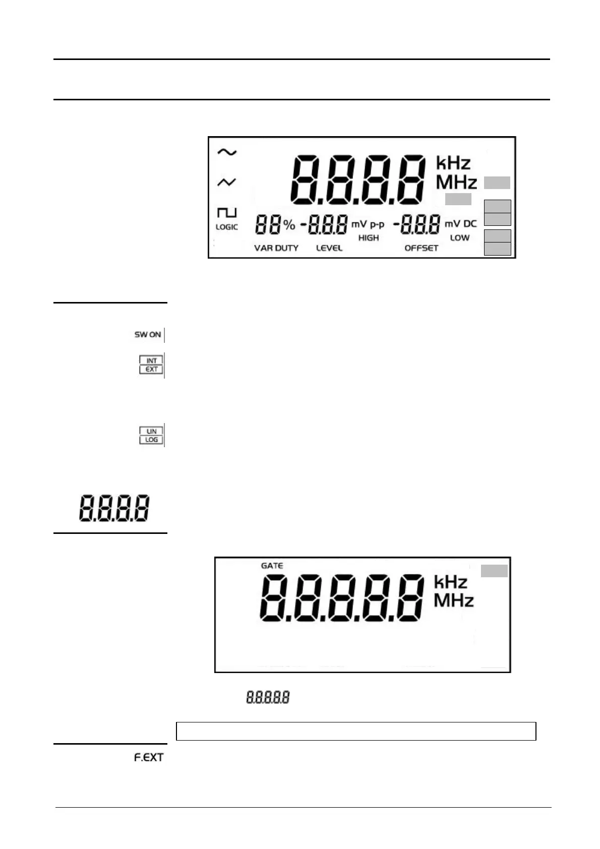 Vista del LCD con los símbolos utilizados en modo generador de barrido