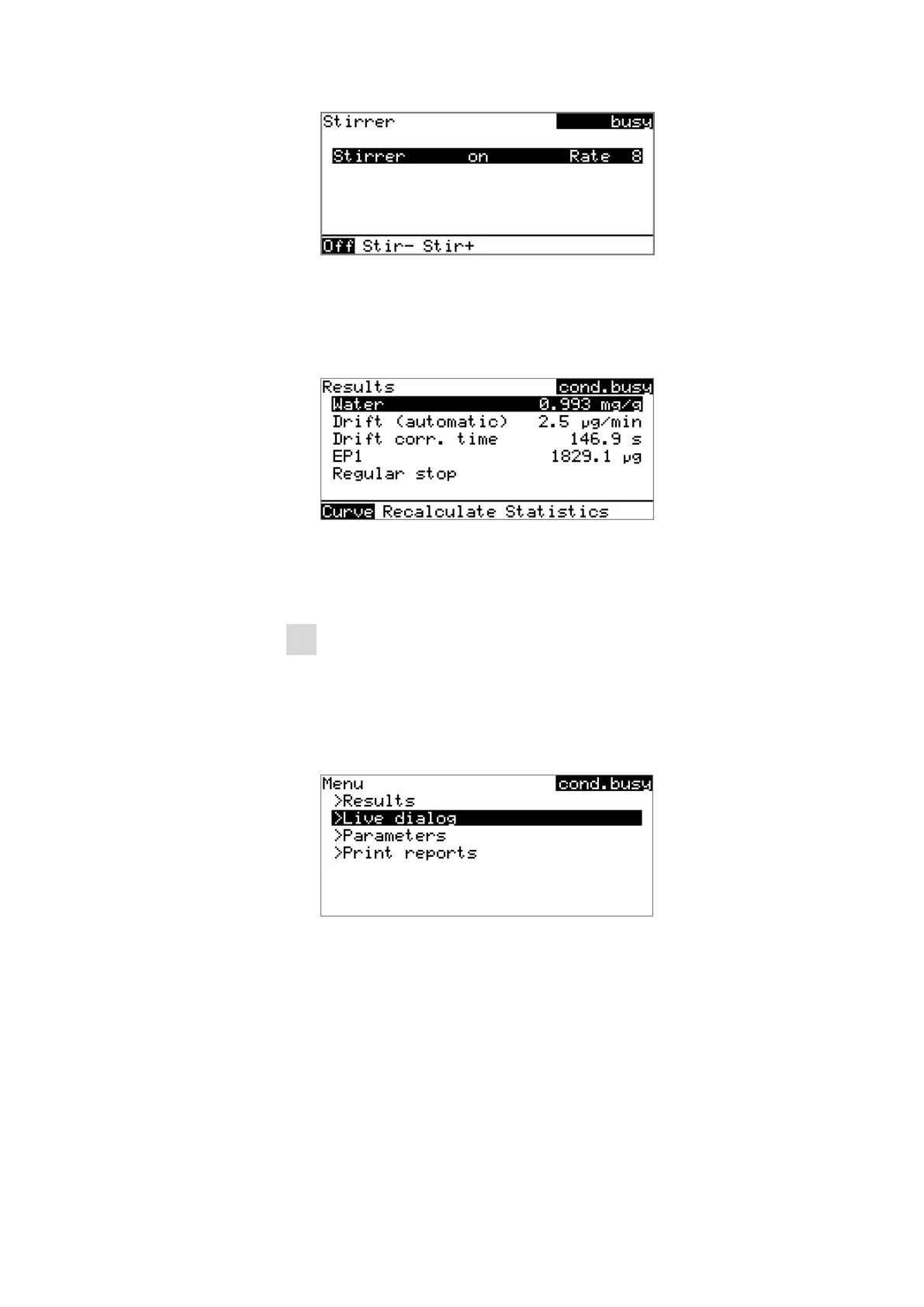 used to switch the stirrer back on. This dialog is exited with [BACK].
