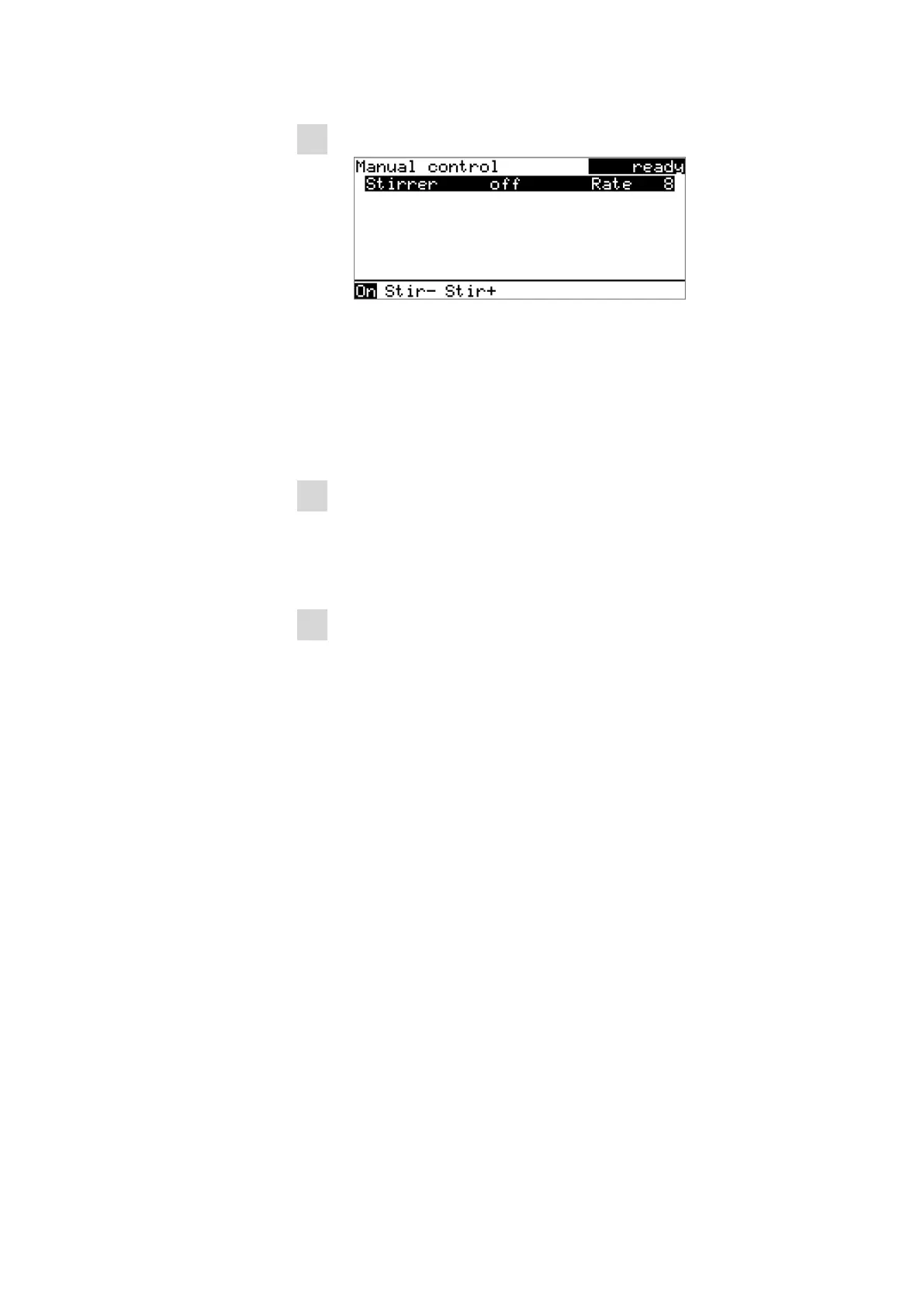 The stirrer is started and stirs at the rate which has been set. Off is