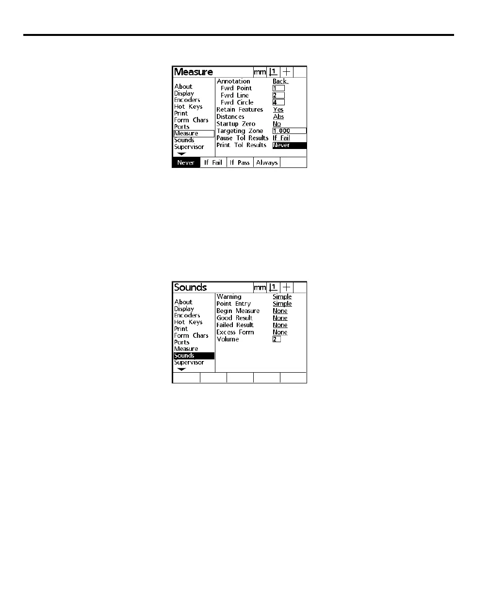 feature tolerances. Press the never soft key to print no report regardless of tolerance