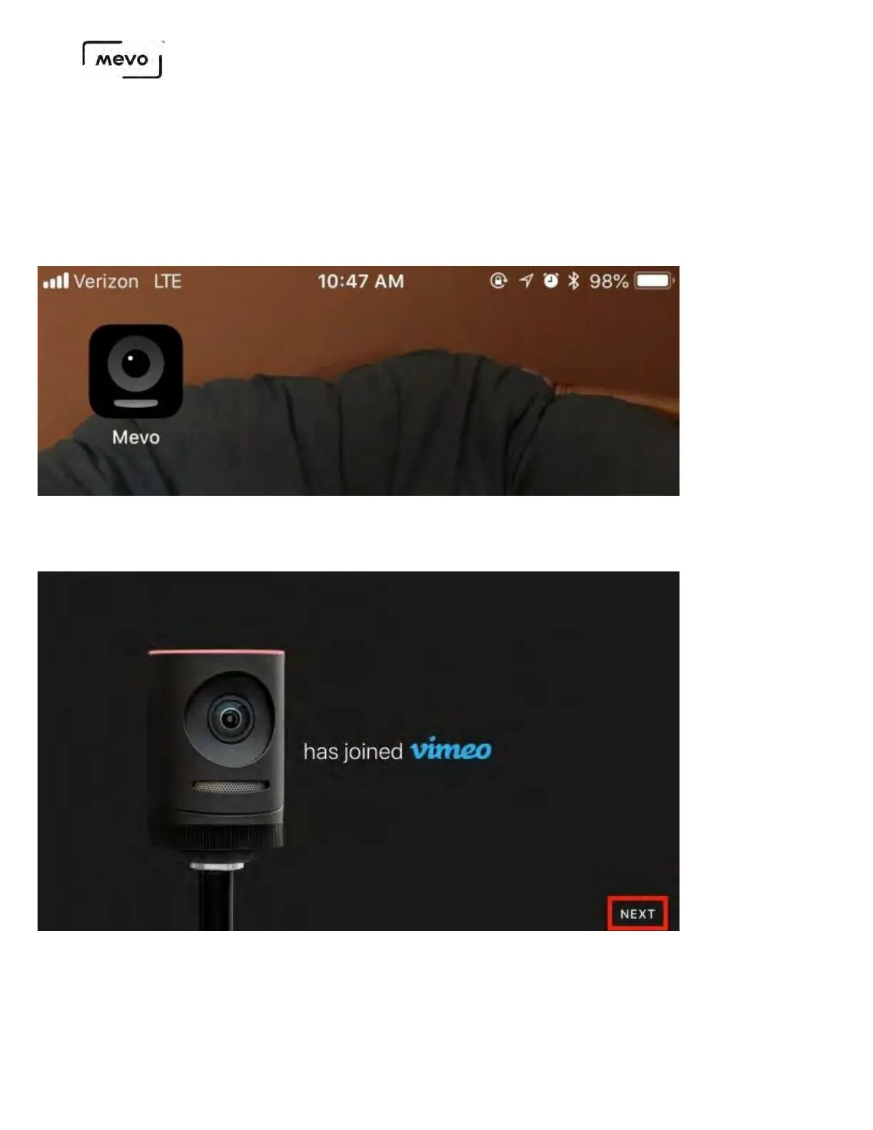 You will first see this screen indicating that Mevo has joined Vimeo. Tap Next to continue.