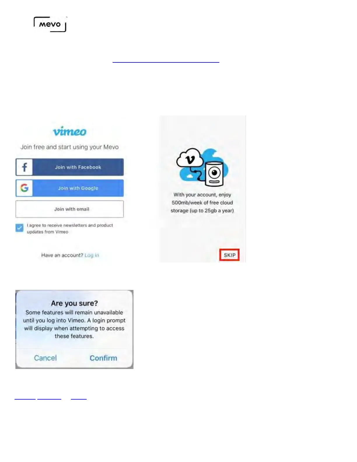 If you do not have a Vimeo plan, you can still use your Mevo Start with its included features. Tap Skip in