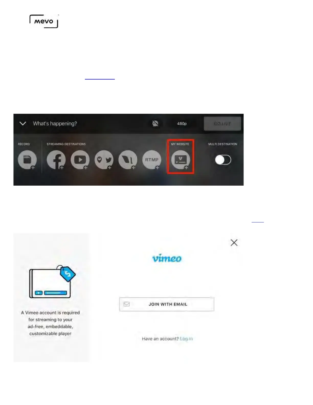 Tapping Vimeo will open the window shown below prompting you to either join or log in to Vimeo. If you