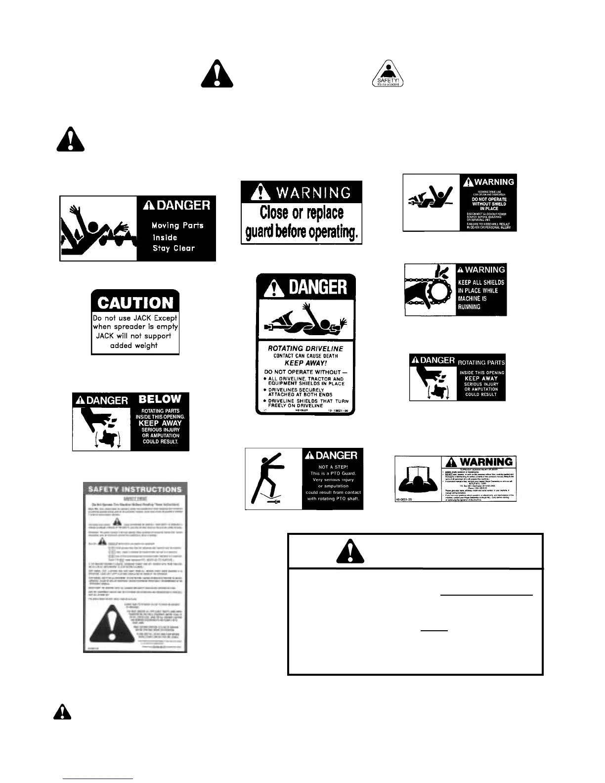 ous decals to aid in operation and warn of danger or caution areas. Pay close attention to all decals on the spreader.