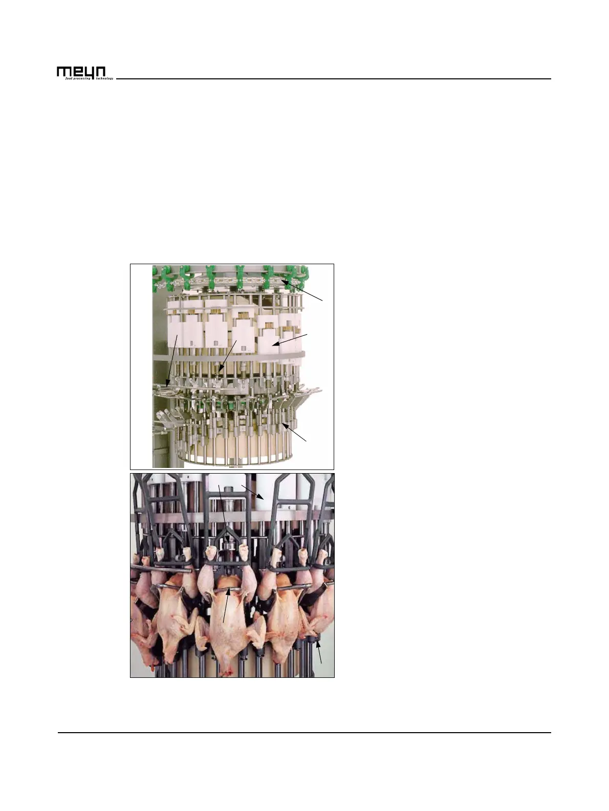 shackles of the overhead conveyor by their feet, are lead through the machine. Inlet