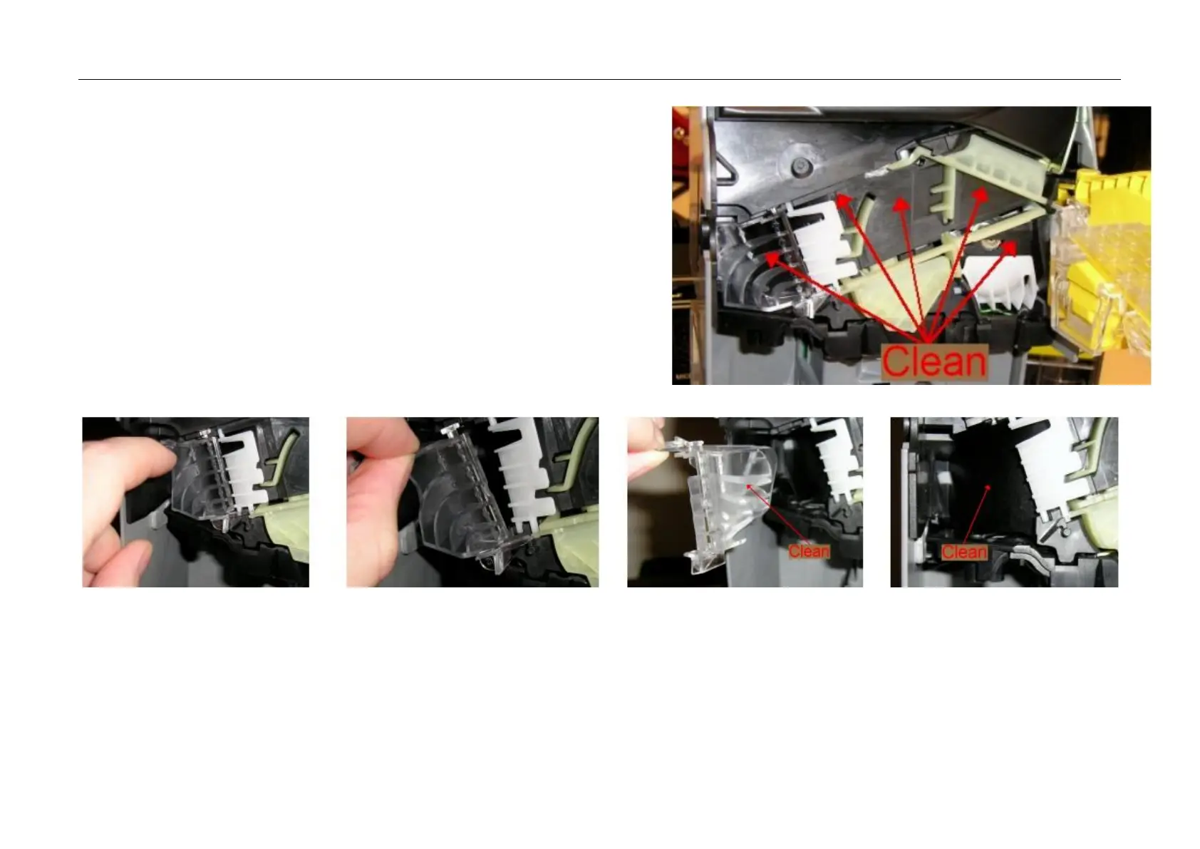 • Remove the „E“ coin path cover by releasing the clip and pulling forward. Clean both