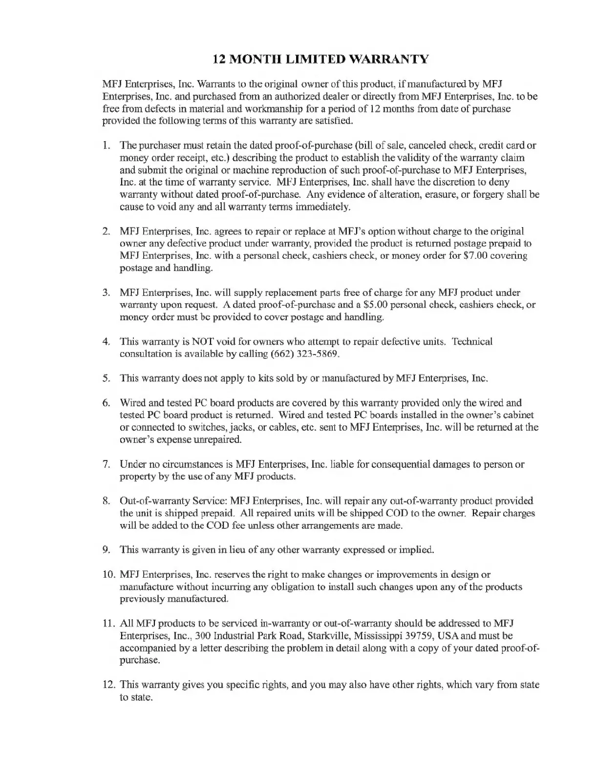 MFJ MFJ-1886 - 12 Month Limited Warranty