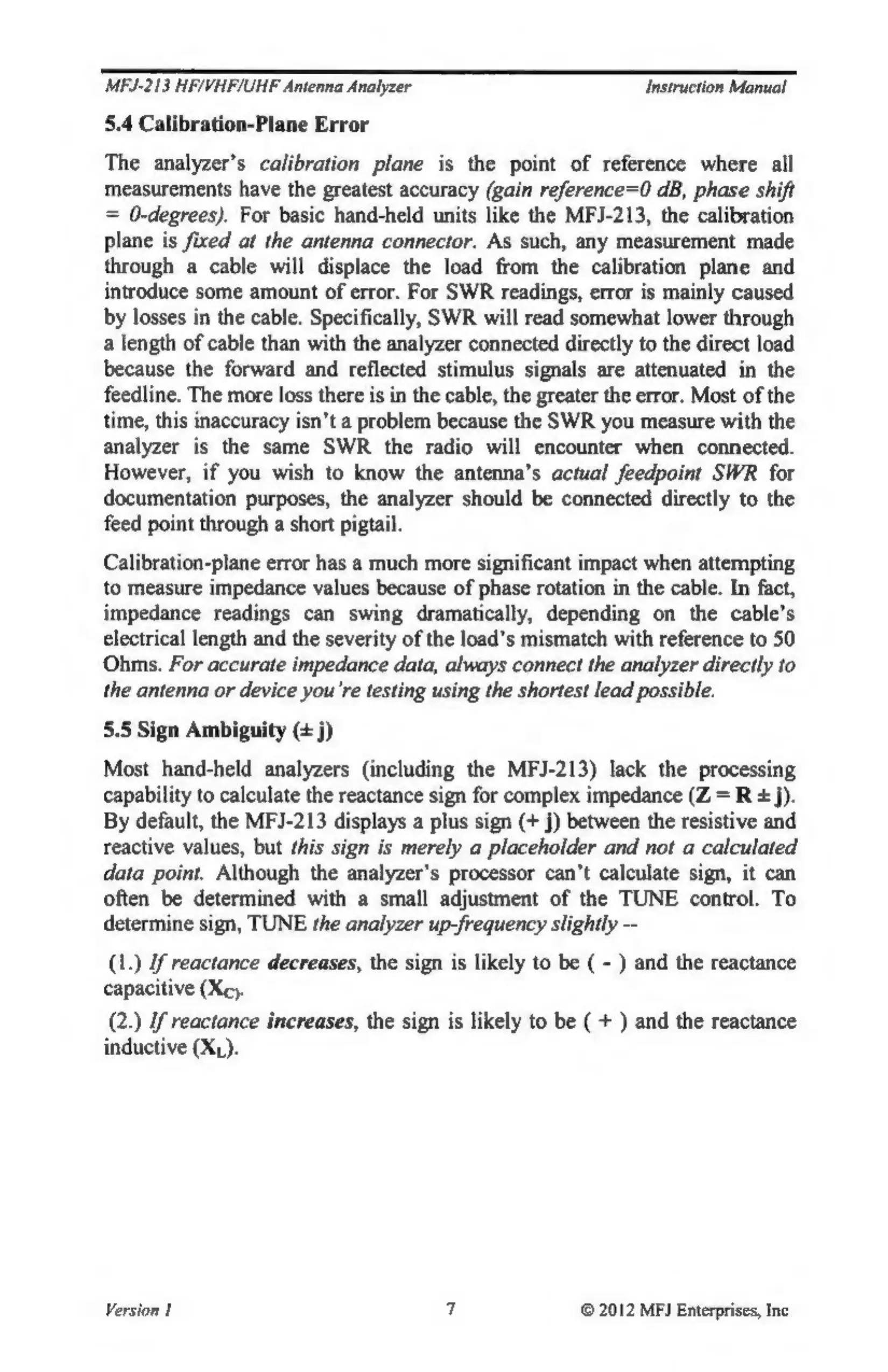 MFJ MFJ-213 - Calibration-Plane Error; Sign Ambiguity (+ J)