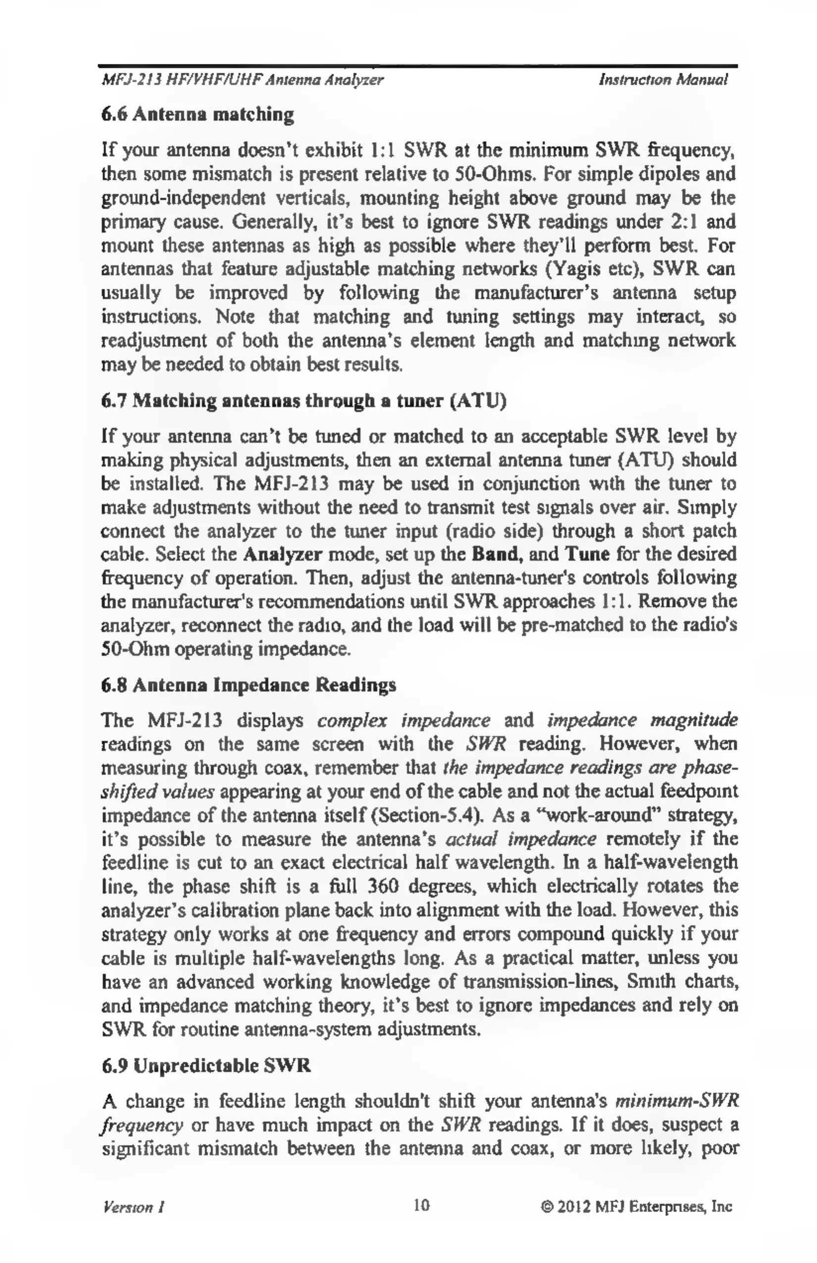 MFJ MFJ-213 - Antenna Matching; Matching Antennas through a Tuner; Antenna Impedance Readings; Unpredictable SWR