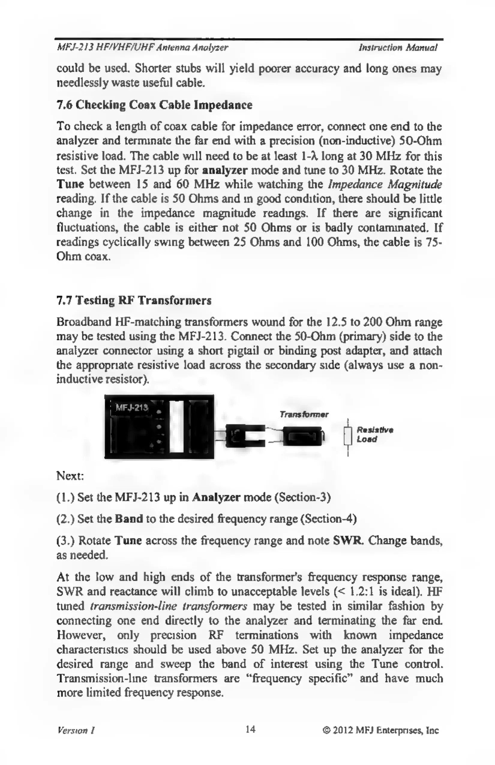 MFJ MFJ-213 - Checking Coax Cable; Testing RF Transformers