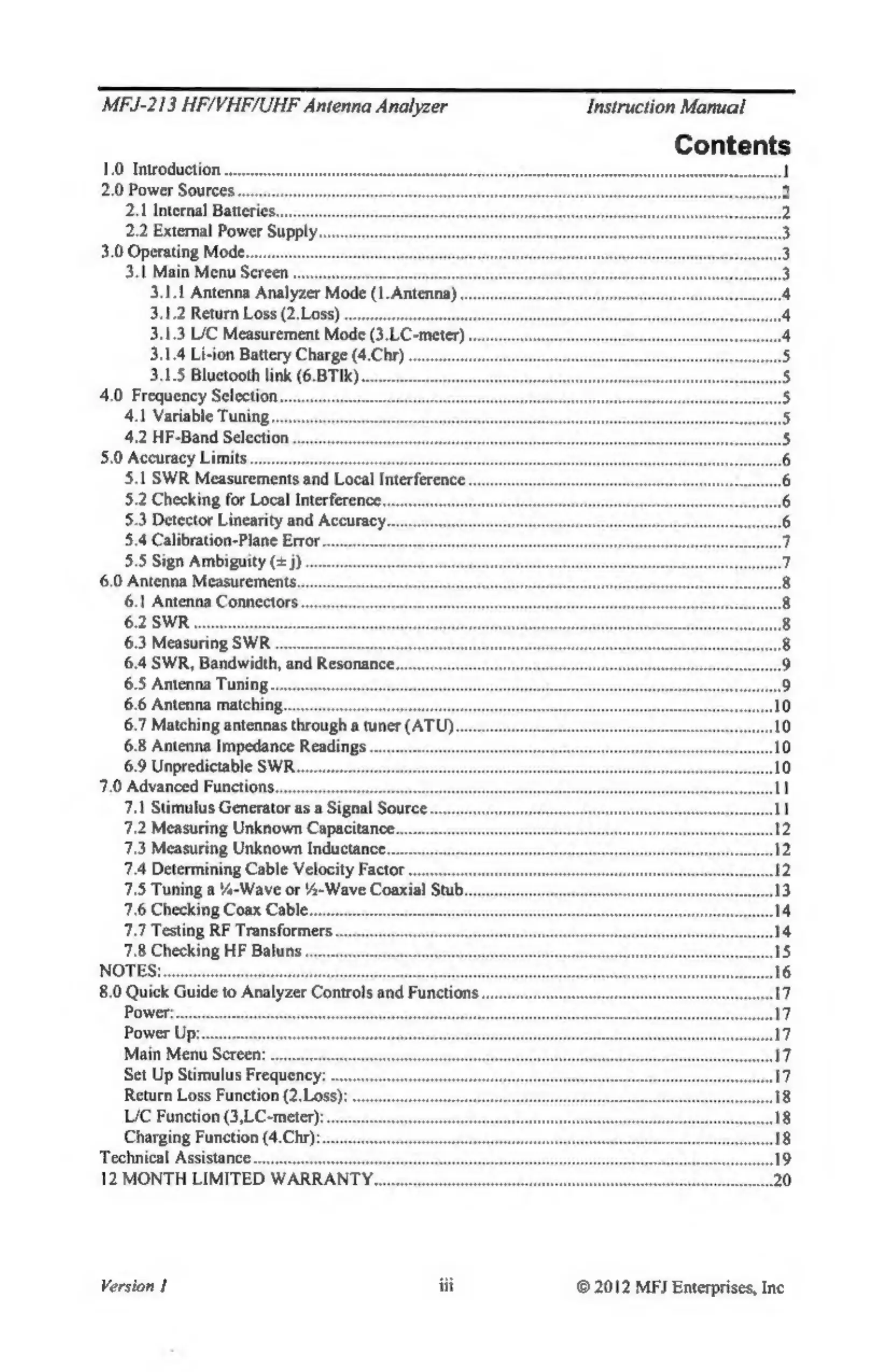 MFJ MFJ-213 - Table of Contents