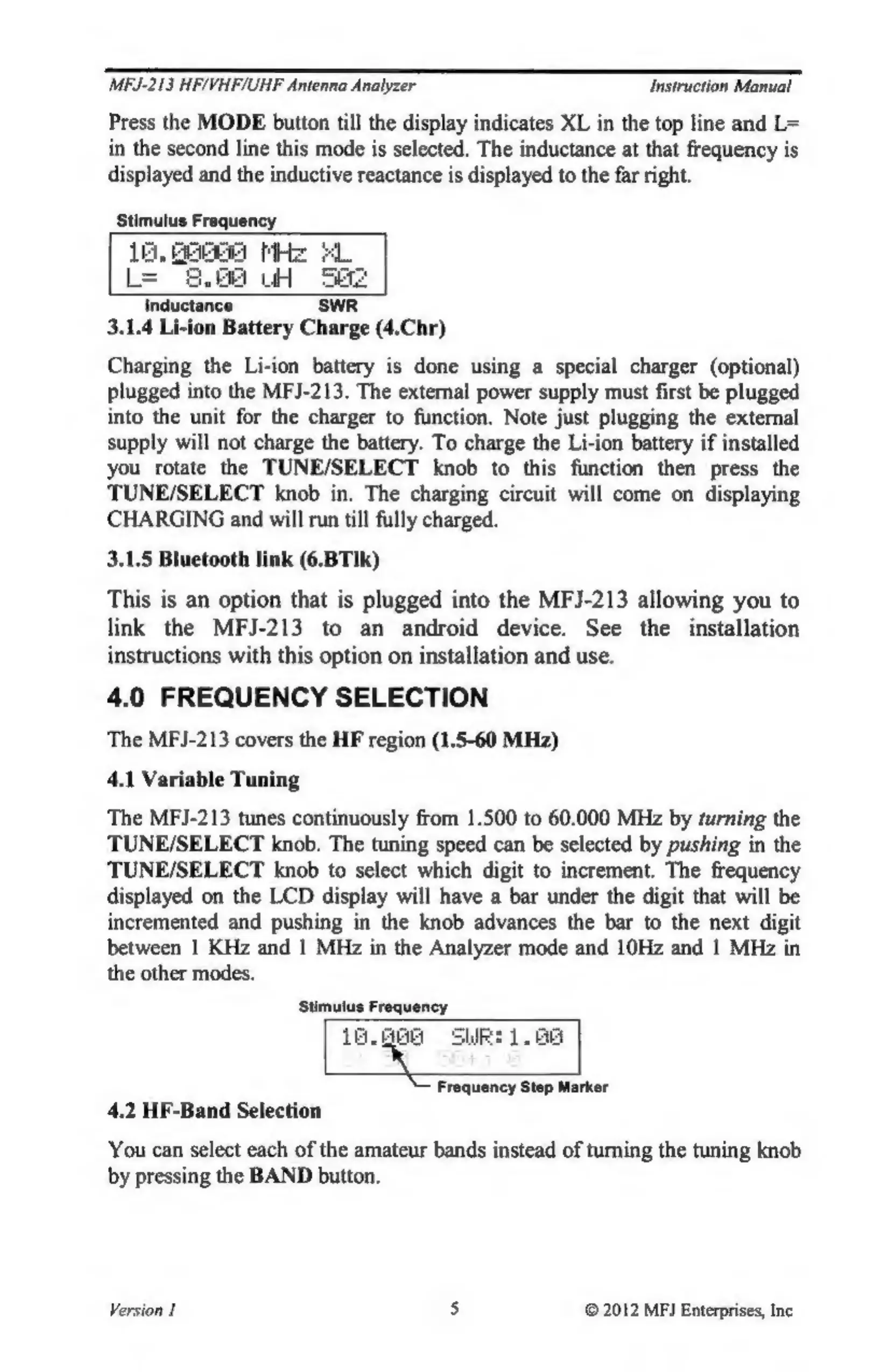 MFJ MFJ-213 - Li-Ion Battery Charge (4.Chr); Bluetooth Link; Frequency Selection; Variable Tuning