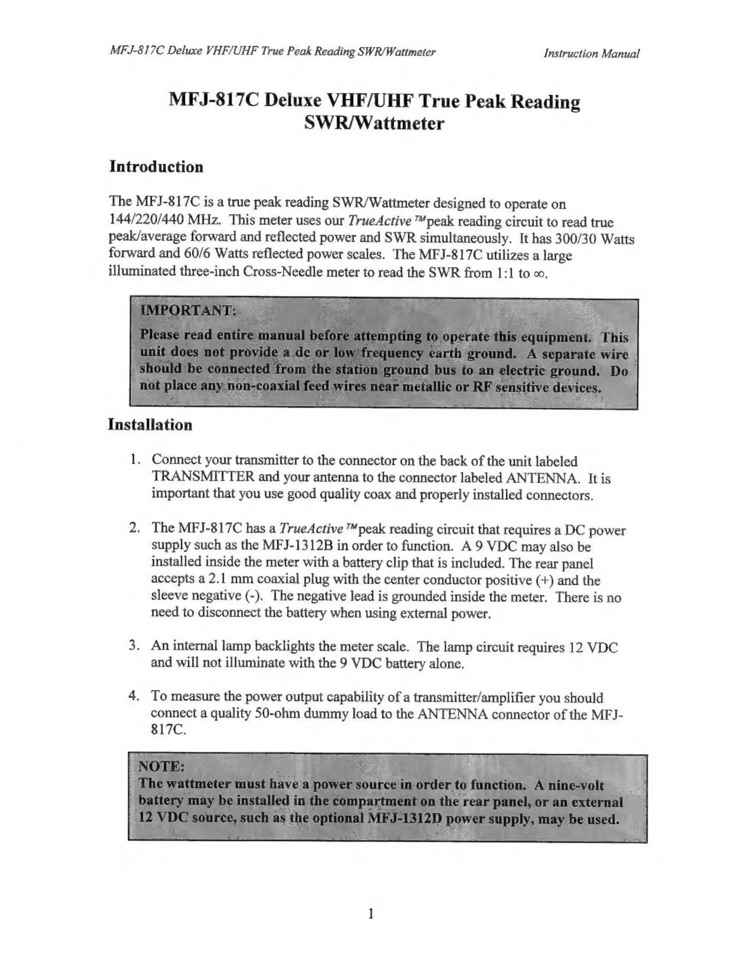 MFJ MFJ-817C - Introduction; Installation Guide; Connecting Transmitter and Antenna; Power Source Requirements