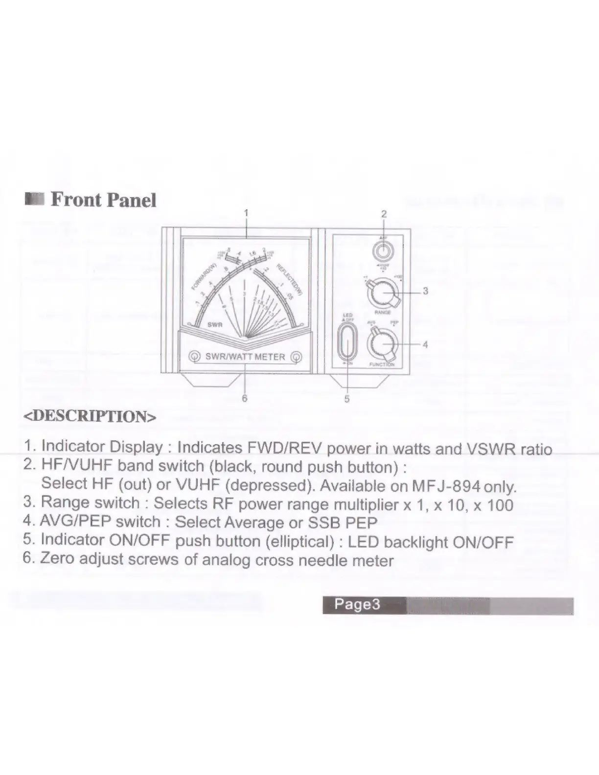MFJ MFJ-891 - Front Panel Overview; Indicator Display; HF;VUHF Band Switch; Range Switch